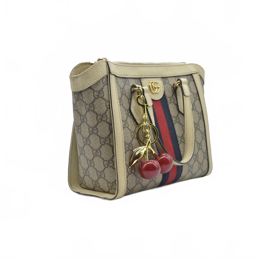 Gucci GG Supreme Monogram Textured Dollar Calfskin Web Small Ophidia Tote Bag Beige Ebony Mystic White