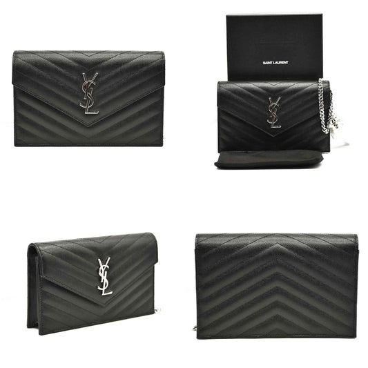 YSL SAINT LAURENT Grain De Poudre Matelasse Chevron Monogram Chain Wallet Black Silver