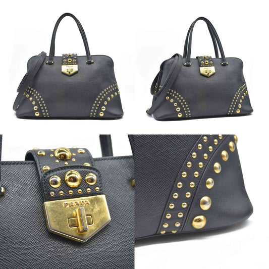 AUCTION $3450 Prada Black Leather Promenade Studded Satchel