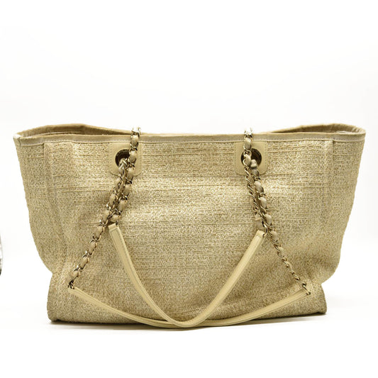 CHANEL Straw Raffia Calfskin Striped MM Deauville Tote Beige