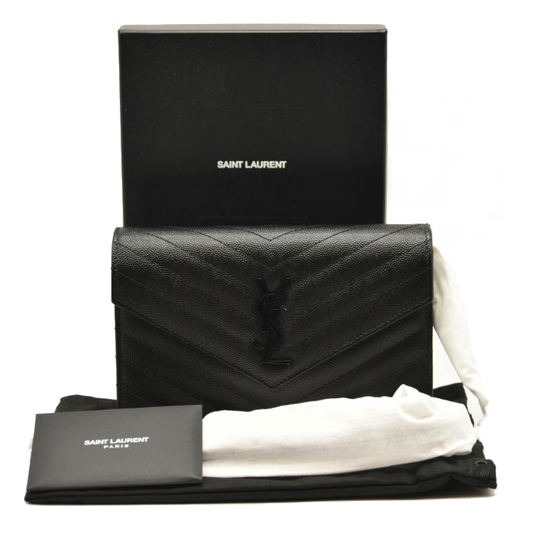 NEW SAINT LAURENT Grain De Poudre Matelasse Chevron Monogram Chain Wallet Black Noir