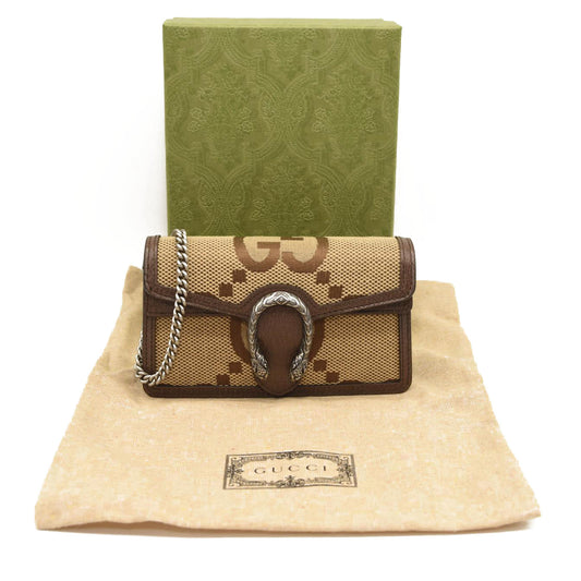 NEW GUCCI Monogram Jumbo GG Textured Dollar Calfskin Super Mini Dionysus Shoulder Bag Camel Ebony New Acero
