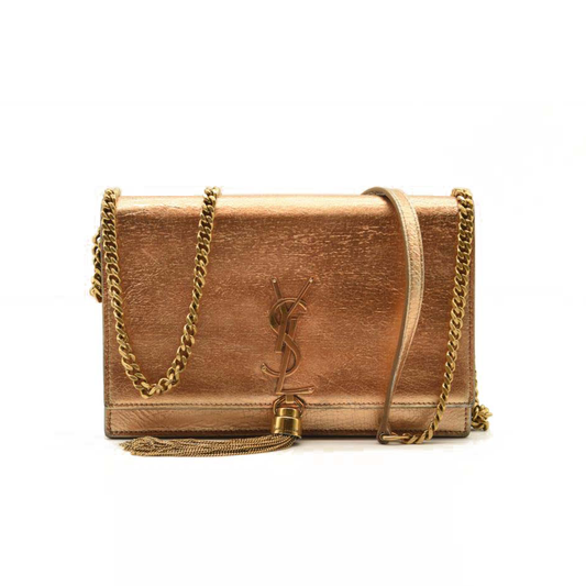 Saint Laurent Metallic Crackled Calfskin Kate Monogram Tassel Chain Wallet Gold