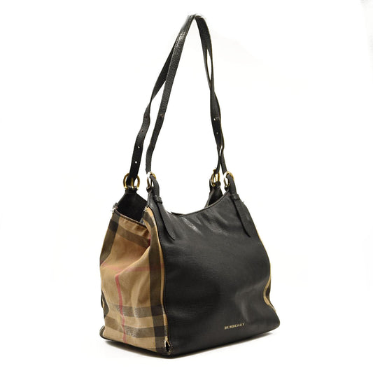 BURBERRY Nova Check Shoulder Tote Bag Leather Canvas Black Beige