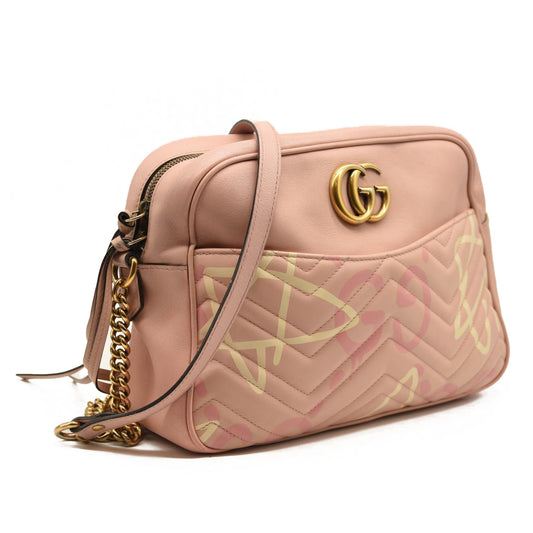 GUCCI Calfskin Matelasse GucciGhost Medium GG Marmont Chain Shoulder Bag Pink