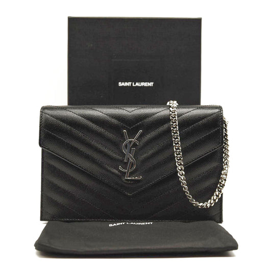 NEW SAINT LAURENT Grain De Poudre Matelasse Chevron Monogram Chain Wallet Black Silver