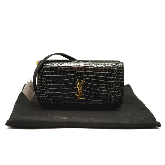 SAINT LAURENT Crocodile Embossed Monogram Phone Holder Crossbody Black