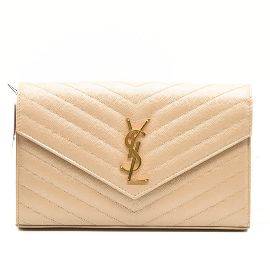 NEW SAINT LAURENT Grain De Poudre Matelasse Chevron Monogram Chain Wallet Dark Beige