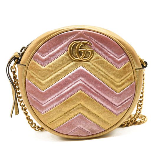 GUCCI Metallic Calfskin Matelasse Mini GG Marmont Round Shoulder Bag Gold Pink