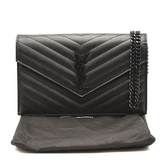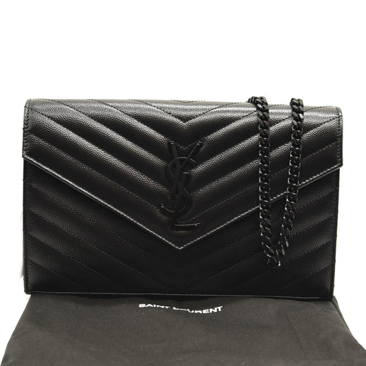 NEW SAINT LAURENT Grain De Poudre Matelasse Chevron Monogram Envelope Chain Wallet Black