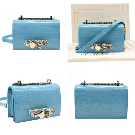 NEW ALEXANDER MCQUEEN Shiny Crocodile Embossed Jeweled Satchel Blue