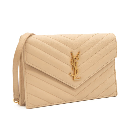 SAINT LAURENT Grain De Poudre Matelasse Chevron Monogram Envelope Chain Wallet Beige