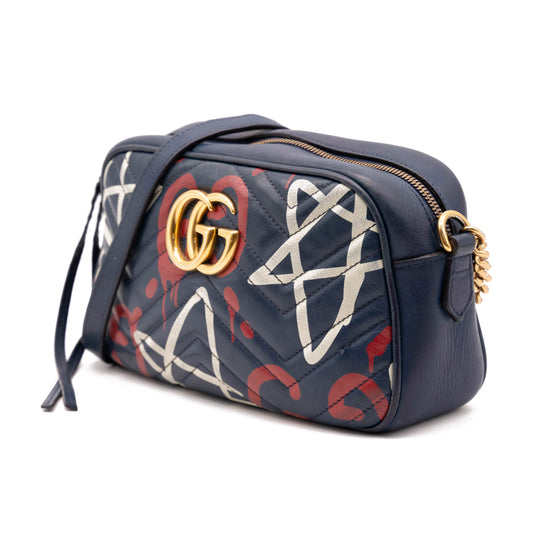 Gucci Marmont Calfskin Matelasse Gucci ghost Chain Blue Leather Shoulder Bag