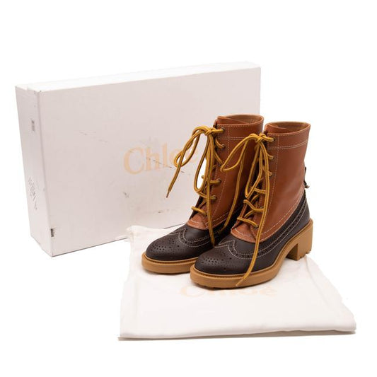 NEW Chloe Brown Leather Franne Luminous Ochre Wing Tip Lug Sole Hiking Boots 38