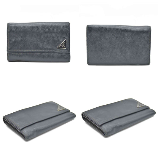 PRADA Logo Plate Saffiano Leather 6 Ring Key Case Black