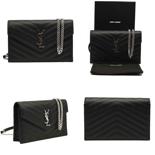 NEW SAINT LAURENT Grain De Poudre Matelasse Chevron Monogram Chain Wallet Black Silver