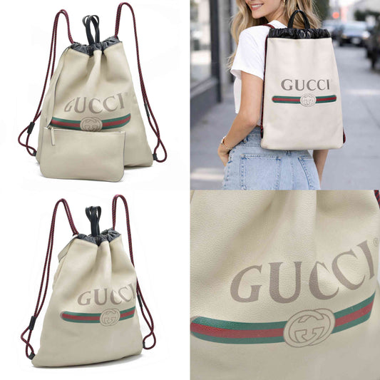 $1980 Gucci Calfskin Logo Drawstring Backpack Mystic White