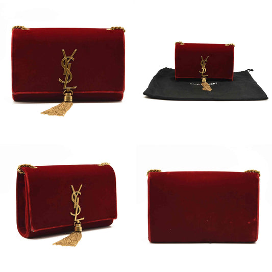 SAINT LAURENT Velvet Medium Monogram Kate Tassel Shoulder Bag Red