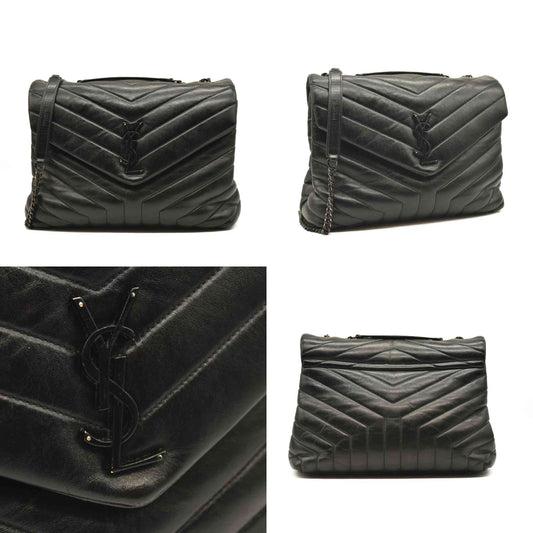 USED SAINT LAURENT Calfskin Y Quilted Monogram Medium Loulou Chain Satchel Black Monochrome