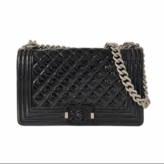 $2940 Chanel Patent Quilted Round Clutch with Chain