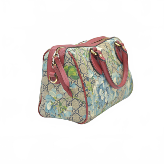 $1390 Gucci GG Supreme Monogram Blooms Small Boston Beige Blue Navy Hibiscus Red