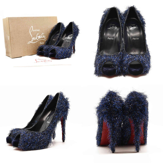Christian Louboutin Very Prive 120 Peep Toe Blue Glitter Metallic Threads Pump Shoe 8 US