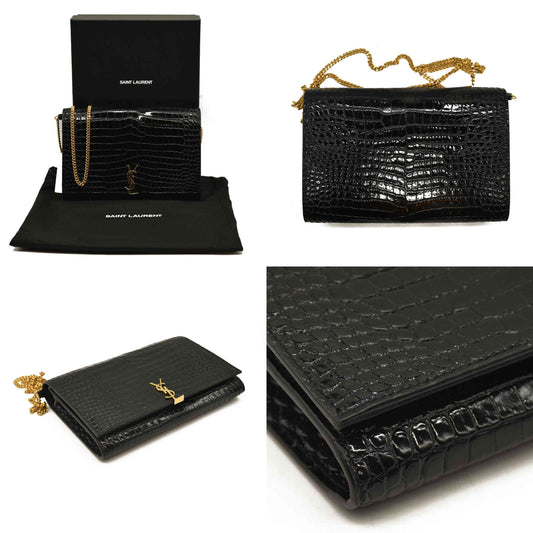 SAINT LAURENT PARIS Saint Laurent Black Croc Embossed Leather Monogram Wallet On Chain