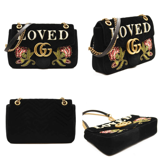 USED Gucci Velvet Matelasse Loved Embroidered Medium GG Marmont Shoulder Bag Black