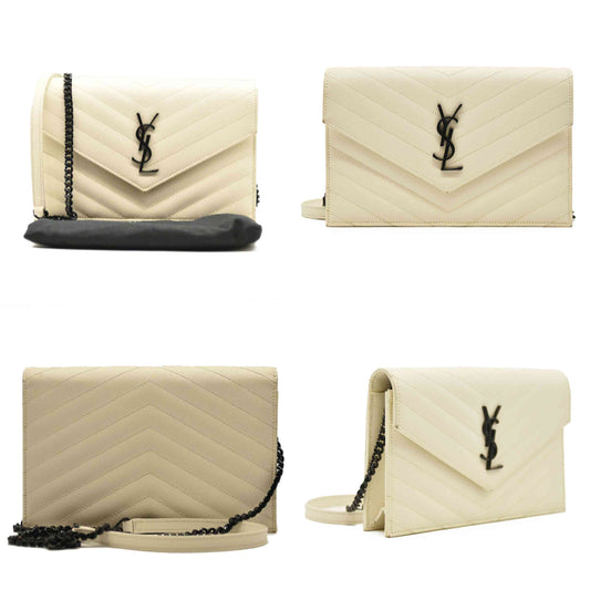 SAINT LAURENT Grain De Poudre Matelasse Chevron Monogram Envelope Chain Wallet Cream