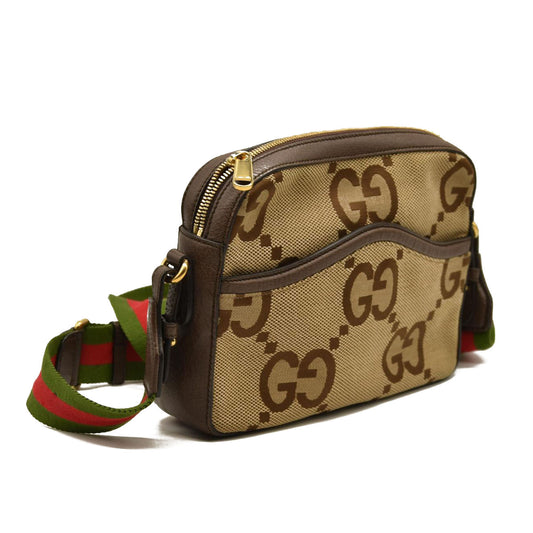 GUCCI Monogram Jumbo GG Textured Dollar Calfskin Web Messenger Shoulder Bag Camel Ebony New Acero