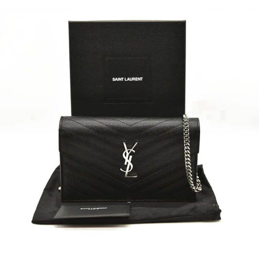 YSL SAINT LAURENT Grain De Poudre Matelasse Chevron Monogram Chain Wallet Black Silver