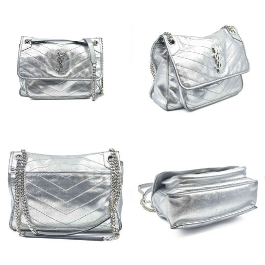 $2590 2019 Saint Laurent Leather Medium Metallic Niki Silver