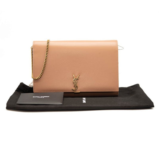 NEW Saint Laurent Glossy Calfskin Monogram Chain Wallet Dark Beige
