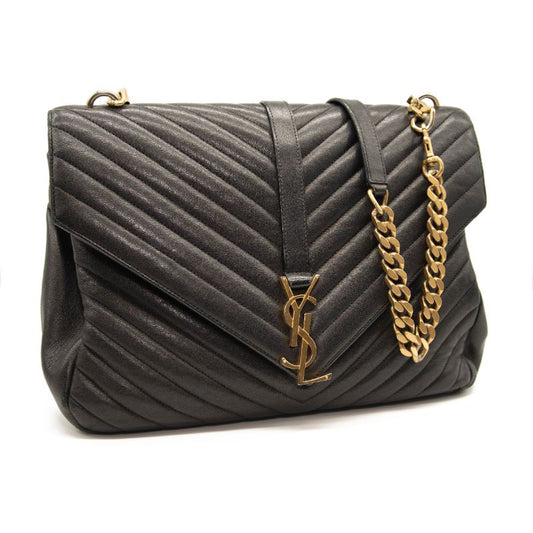 Saint Laurent Sheepskin Matelasse Chevron Monogram Large College Satchel Black Gold
