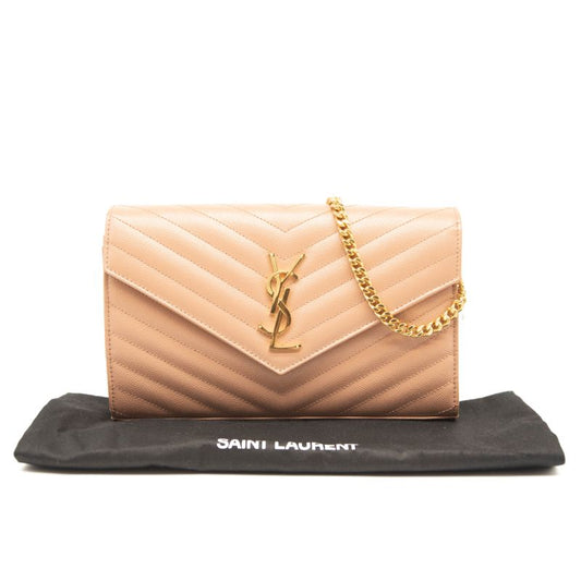 NEW Saint Laurent Grain De Poudre Matelasse Chevron Monogram Chain Wallet Natural Dark WOC