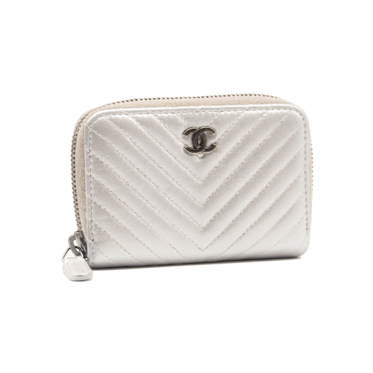Chanel Metallic Lambskin Chevron Quilted Zip Coin Purse Silver Wallet