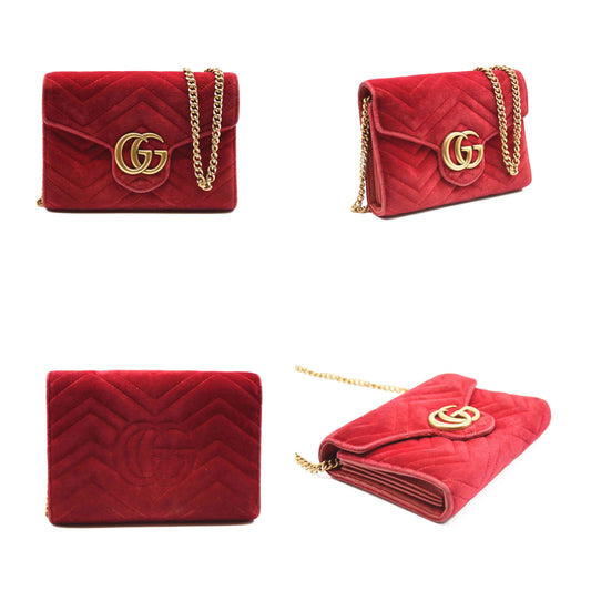 GUCCI Velvet Matelasse GG Marmont Chain Wallet Red