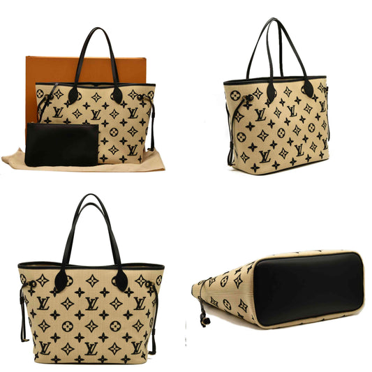 LOUIS VUITTON Cotton Monogram Embroidered Neverfull MM Beige Black RFID