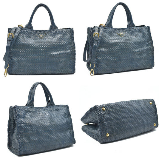 AUCTION $3900 Prada Goatskin Woven Shopping Tote Blue Leather