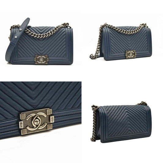 AUCTION $6600 Chanel Wrinkled Leather Chevron Quilted Old Medium Boy Flap Navy Blue