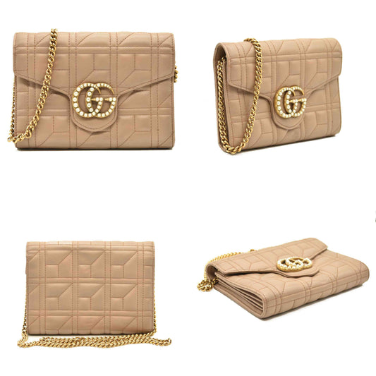 Gucci Calfskin Matelasse Mini Pearly GG Marmont Chain Wallet Beige