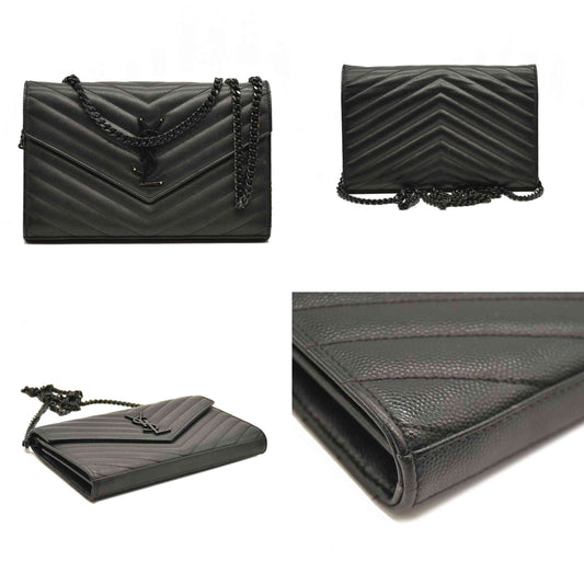 Saint Laurent Grain De Poudre Matelasse Chevron Monogram Monochrome Chain Wallet Black