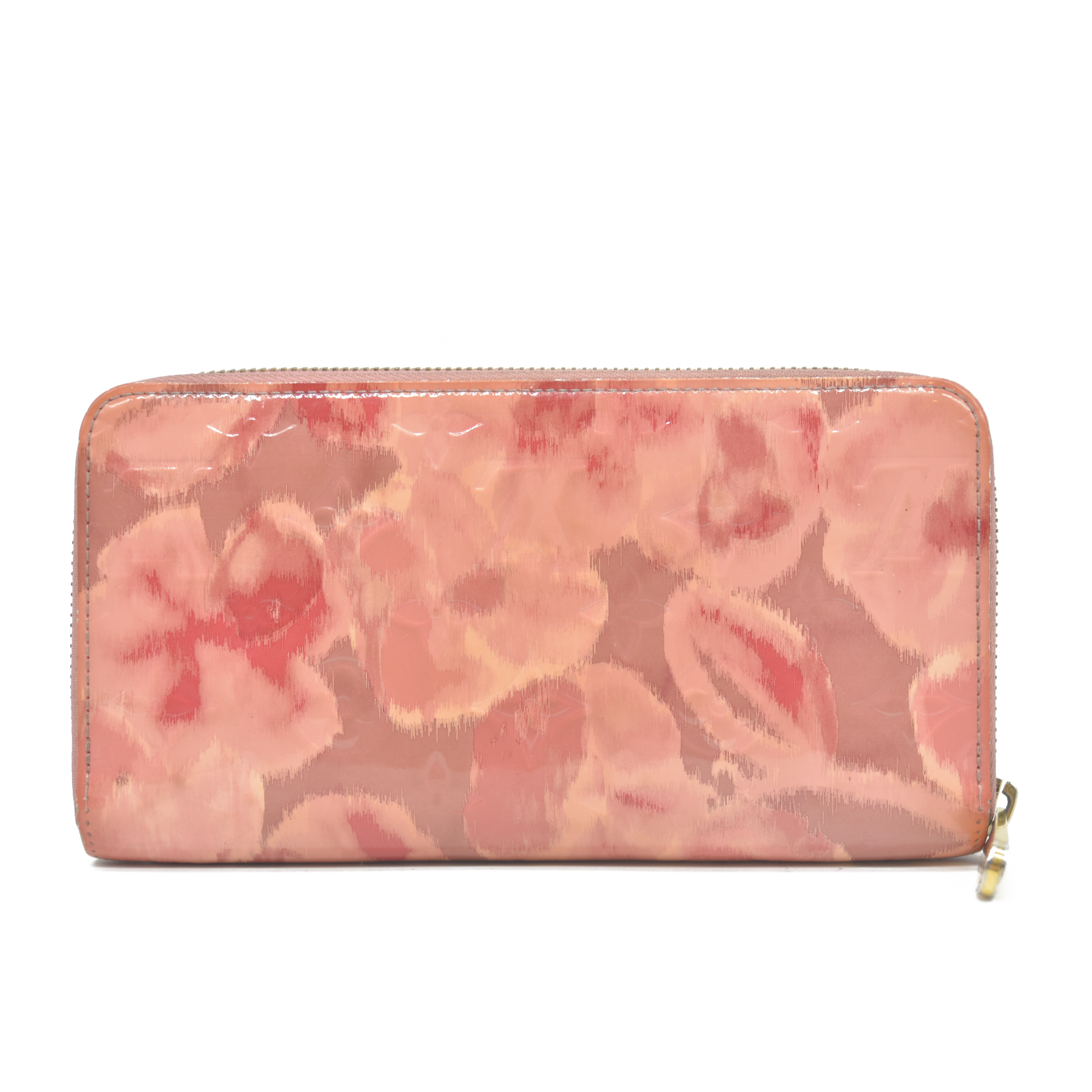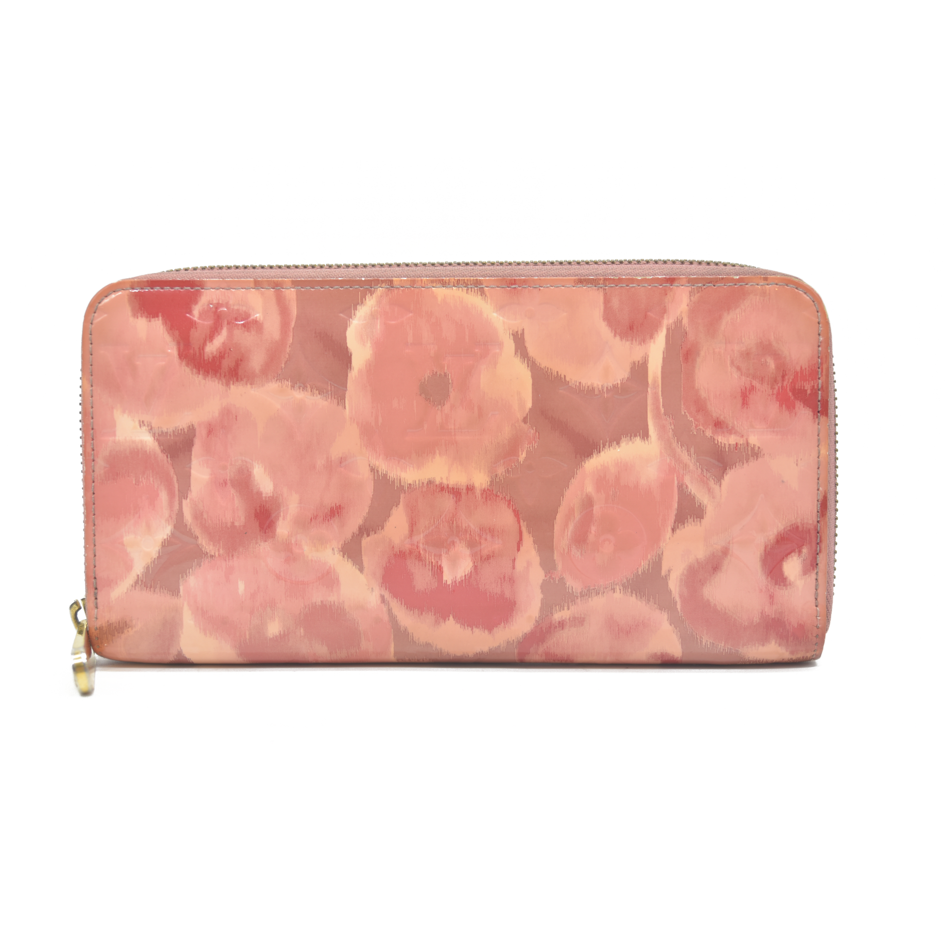 This is an authentic LOUIS VUITTON Vernis Ikat Zippy Wallet in Rose Velours. This chic and compact wallet is crafted of glossy monogram vernis patent leather in a floral pattern. It features a 3/4 wrap around brass zipper that opens with accordion sides to three main pockets, one with a zippered section, and the others with card slots and flat pockets.