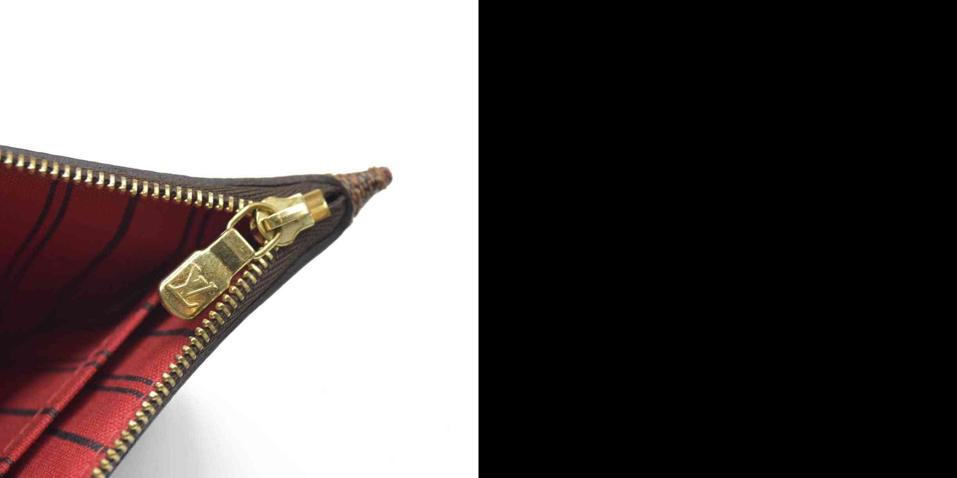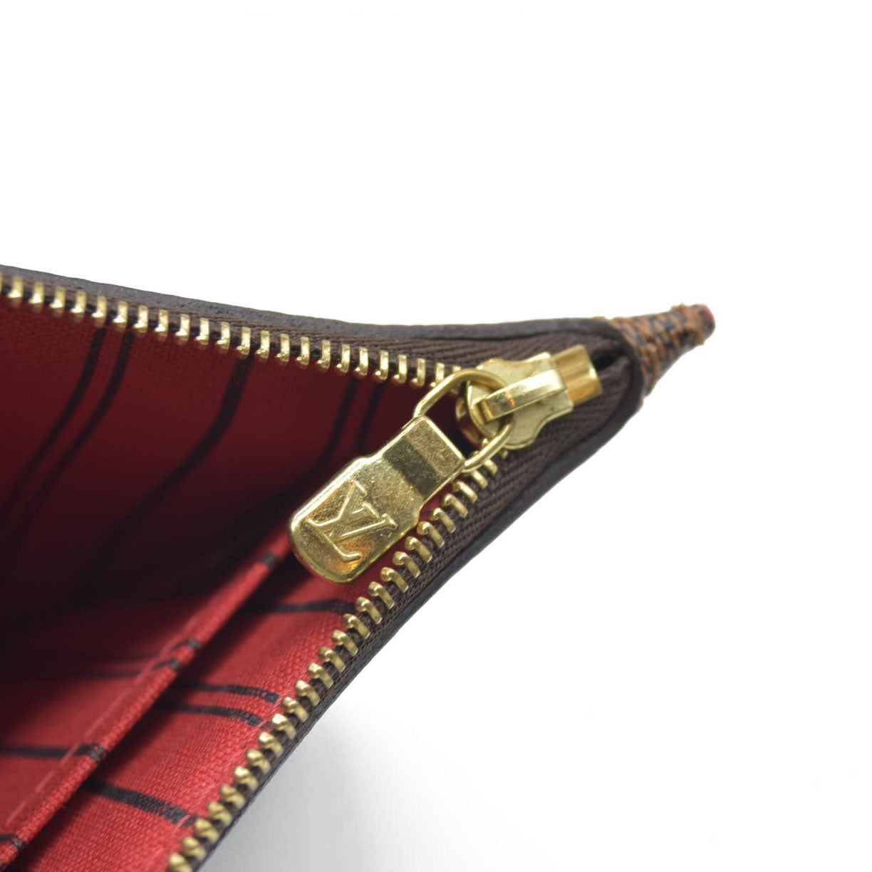This is the authentic LOUIS VUITTON Damier Ebene Neverfull MM GM Pochette. This stylish wristlet is crafted with the signature Louis Vuitton Damier coated canvas. The pouch features a brown leather wristlet and gold hardware. The polished gold top zipper opens to a red-striped fabric interior with a patch pocket.