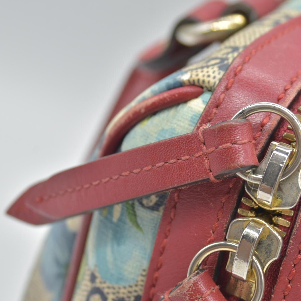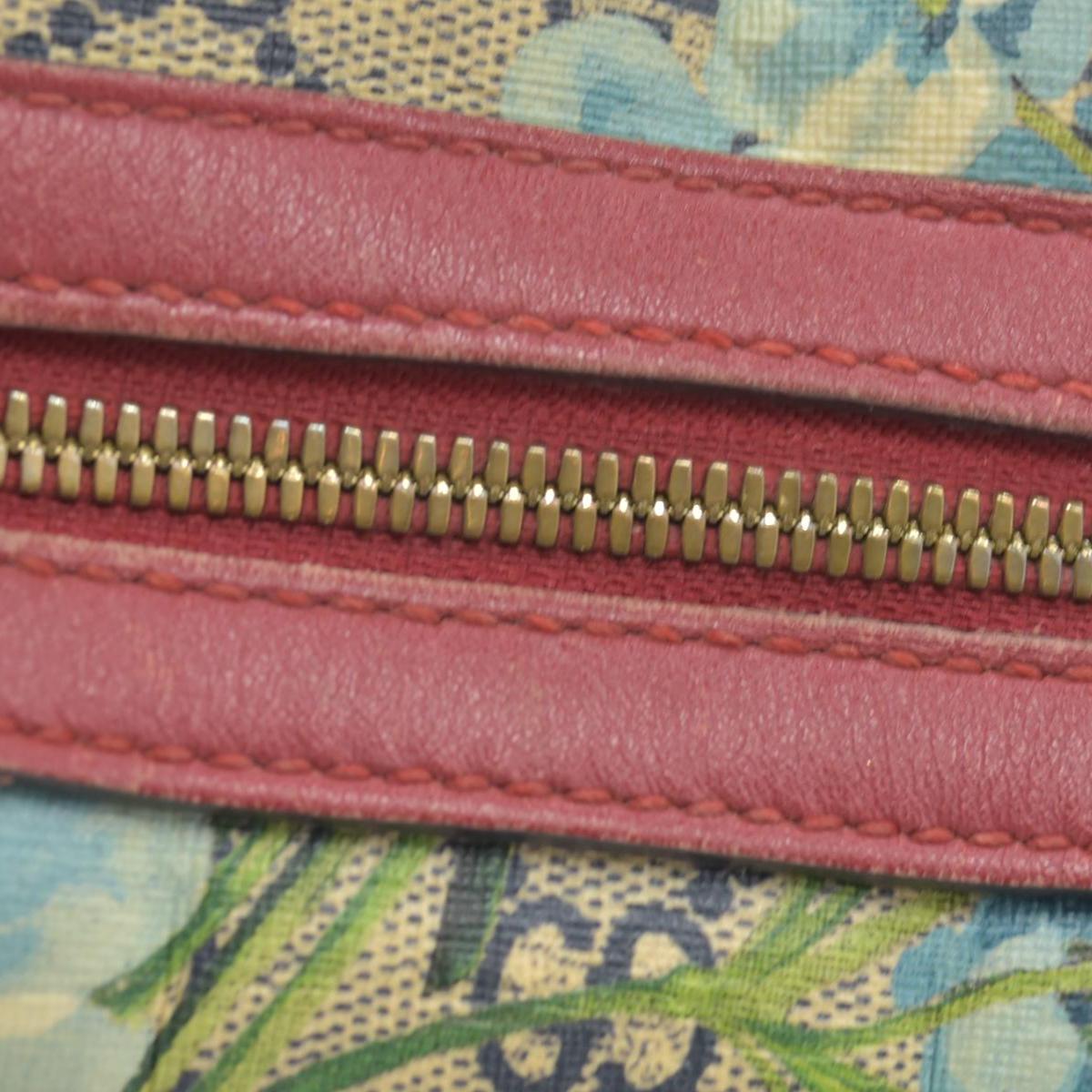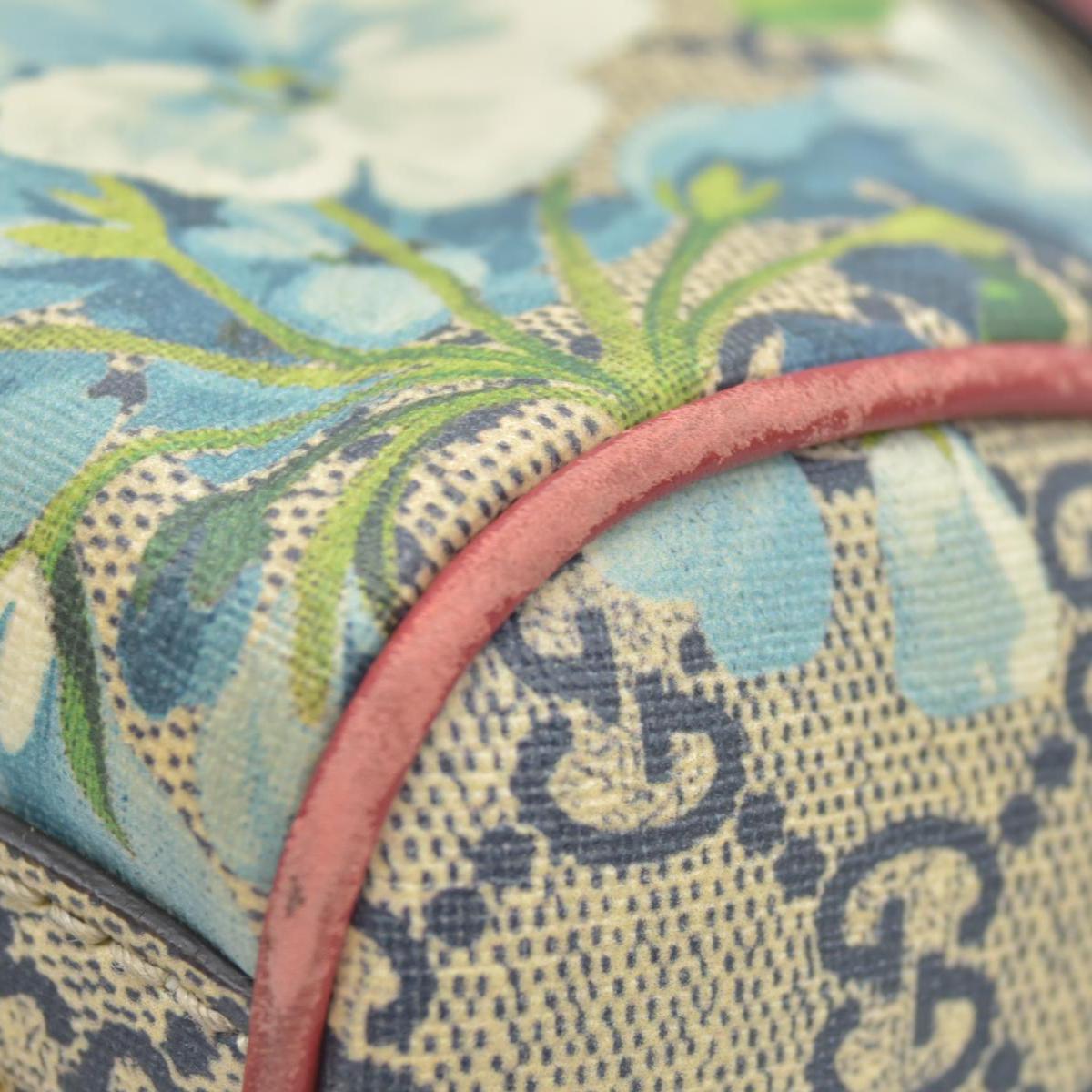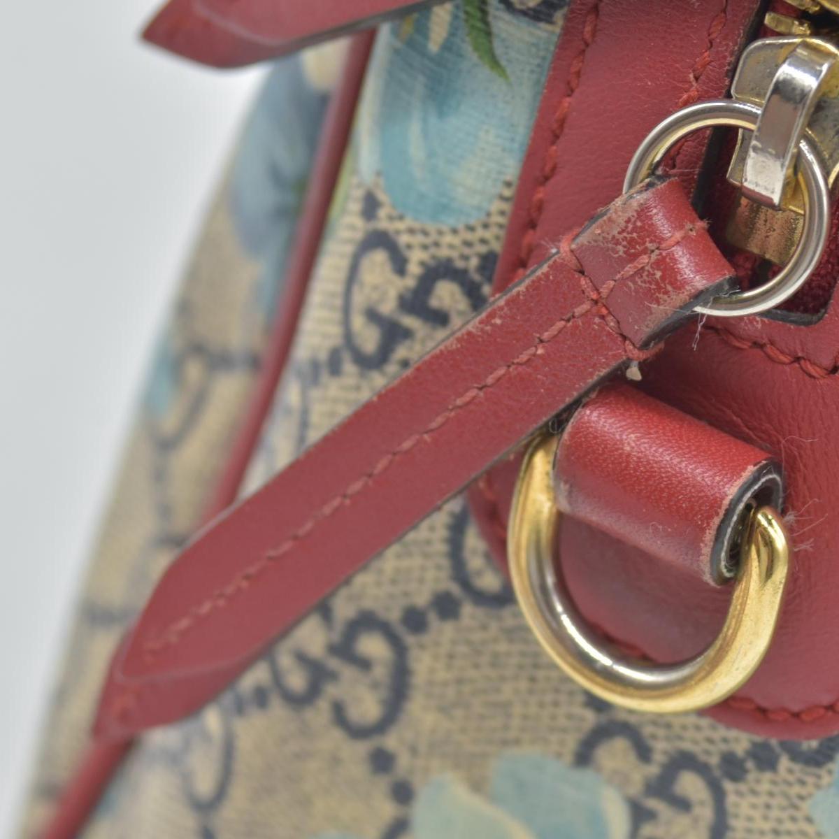 This is an authentic GUCCI GG Supreme Monogram Blooms Small Top Handle Boston Bag in Blue. This stunning handbag is crafted of Gucci GG monogram coated canvas. The bag features a vibrant blue floral design, red leather top handles, an optional shoulder strap, and brass hardware. The top zips open to a coarse beige suede interior with zipper and patch pockets.