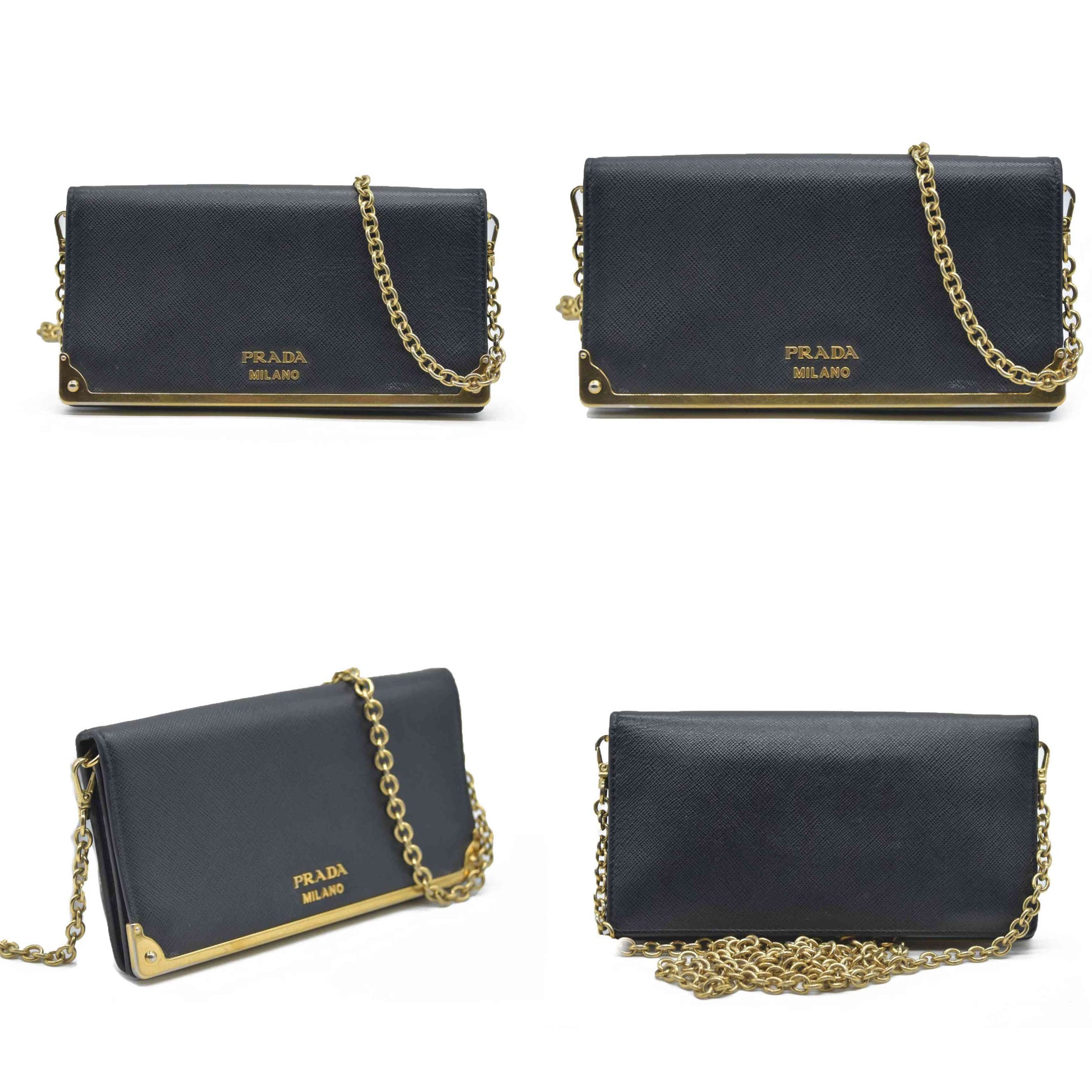 This is an authentic PRADA Saffiano Cahier Chain Wallet in Black. This chic wallet is crafted of Prada signature Saffiano cross grain leather in black. The wallet features a waist length polished gold chain shoulder strap and a full flap with a gold bar base trim. This wallet opens to a matching leather interior with card slots, bill pocket and an open compartment. This is an excellent wallet on chain for day or evening essentials, with the stylish sophistication of Prada!