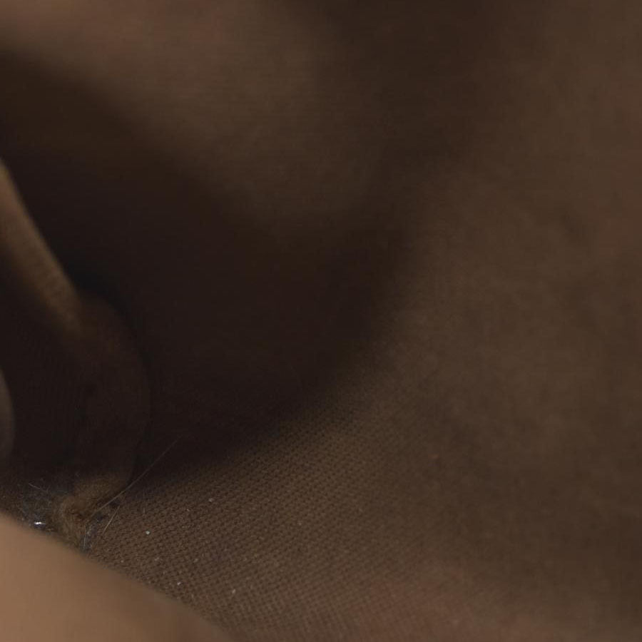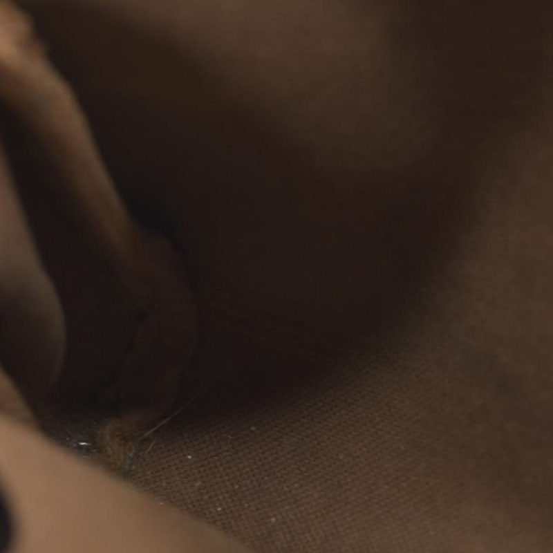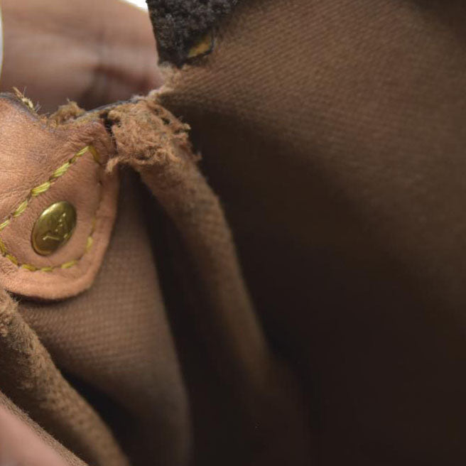 Slightly misshapen handles; broken hardware at closure; minor scuffs at corner; minor discoloration at interior.