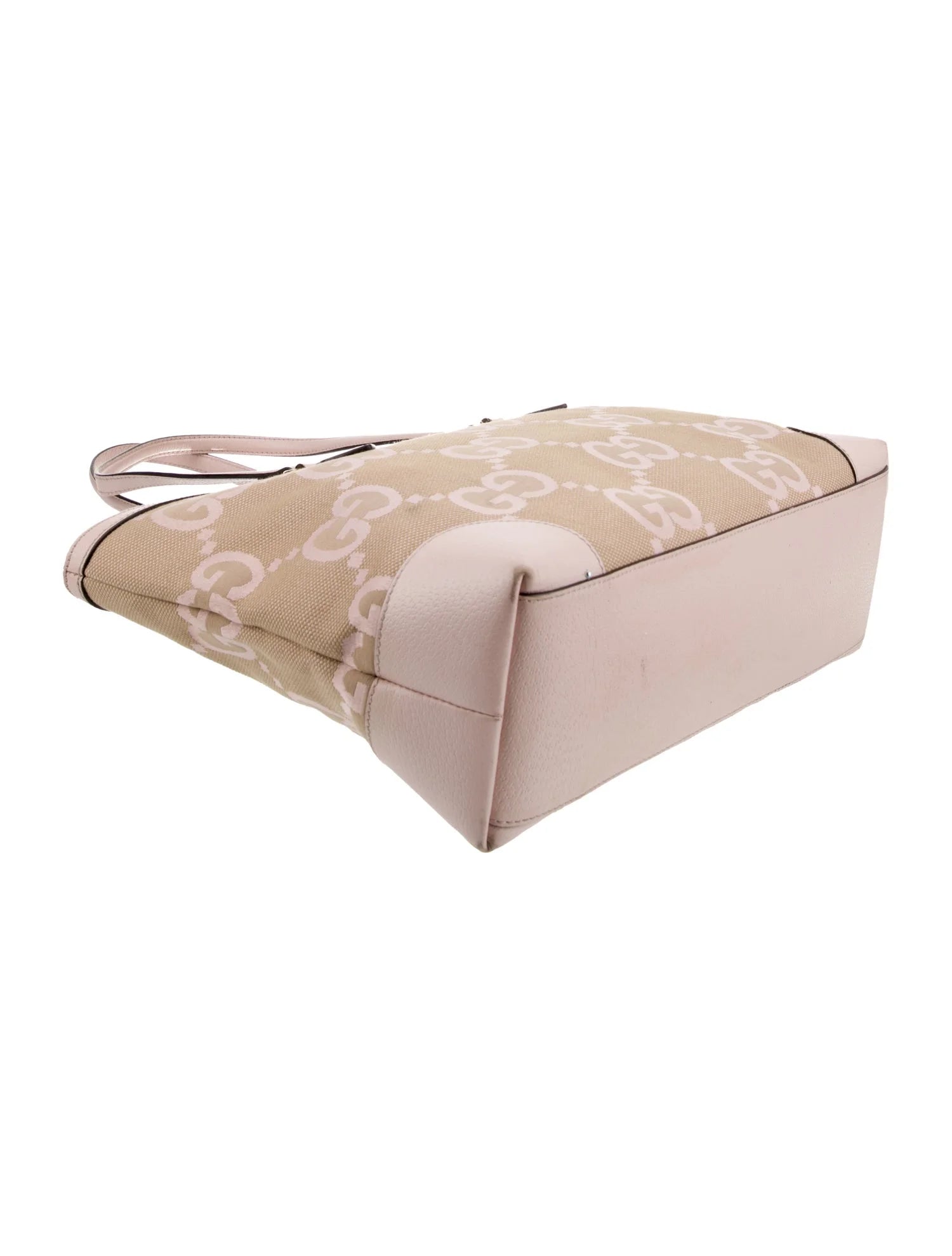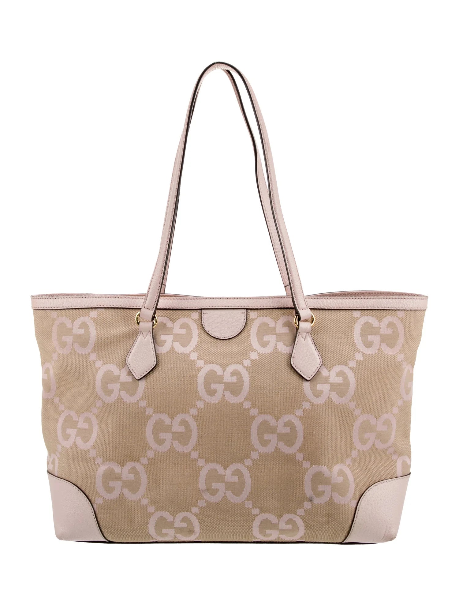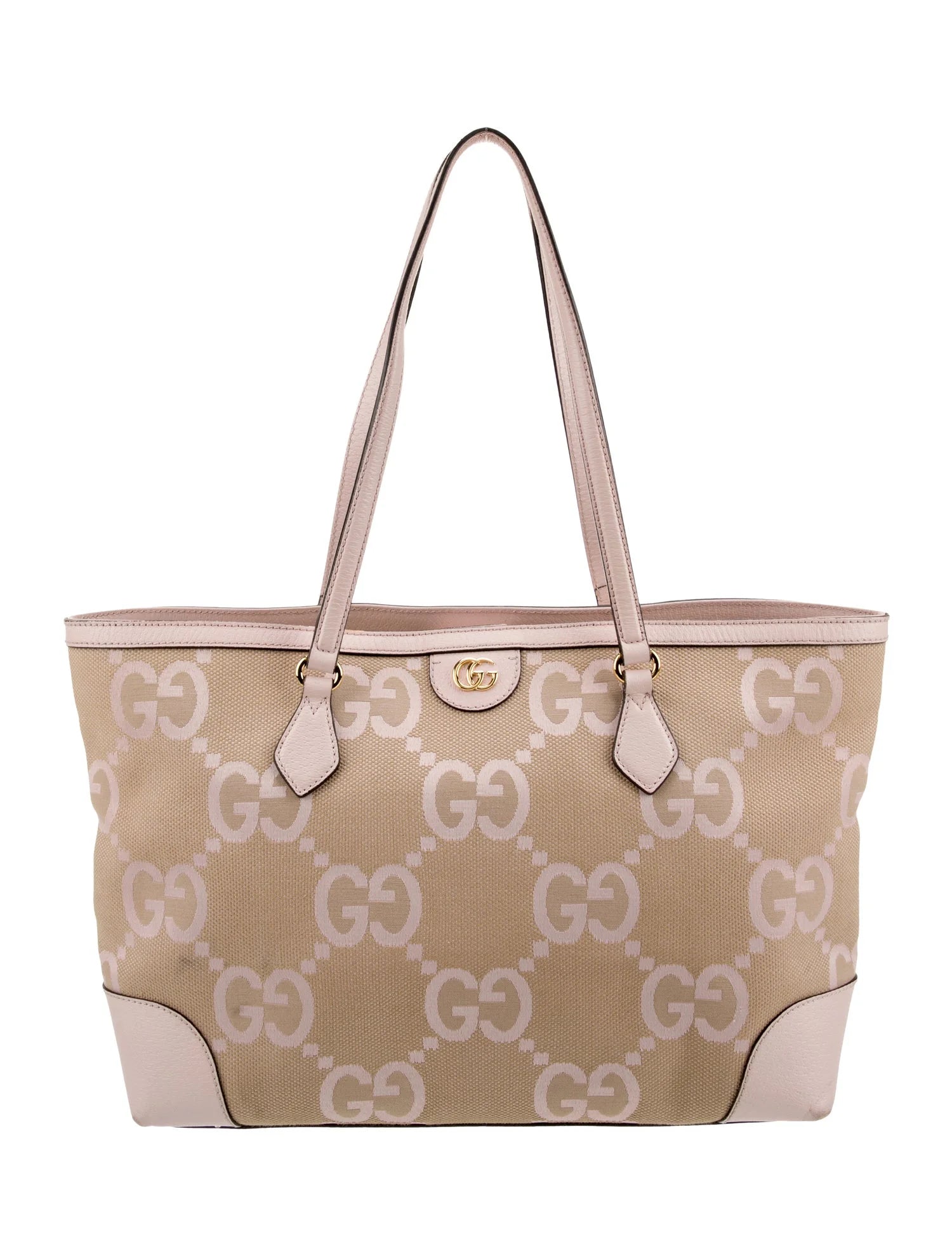 This Gucci Ophidia Medium tote is made from light pink and beige Jumbo GG canvas with light pink leather trim and gold tone hardware. Details include two flat handles, magnetic snap closure, and a fully lined interior with with one open pocket and one zippered pocket.