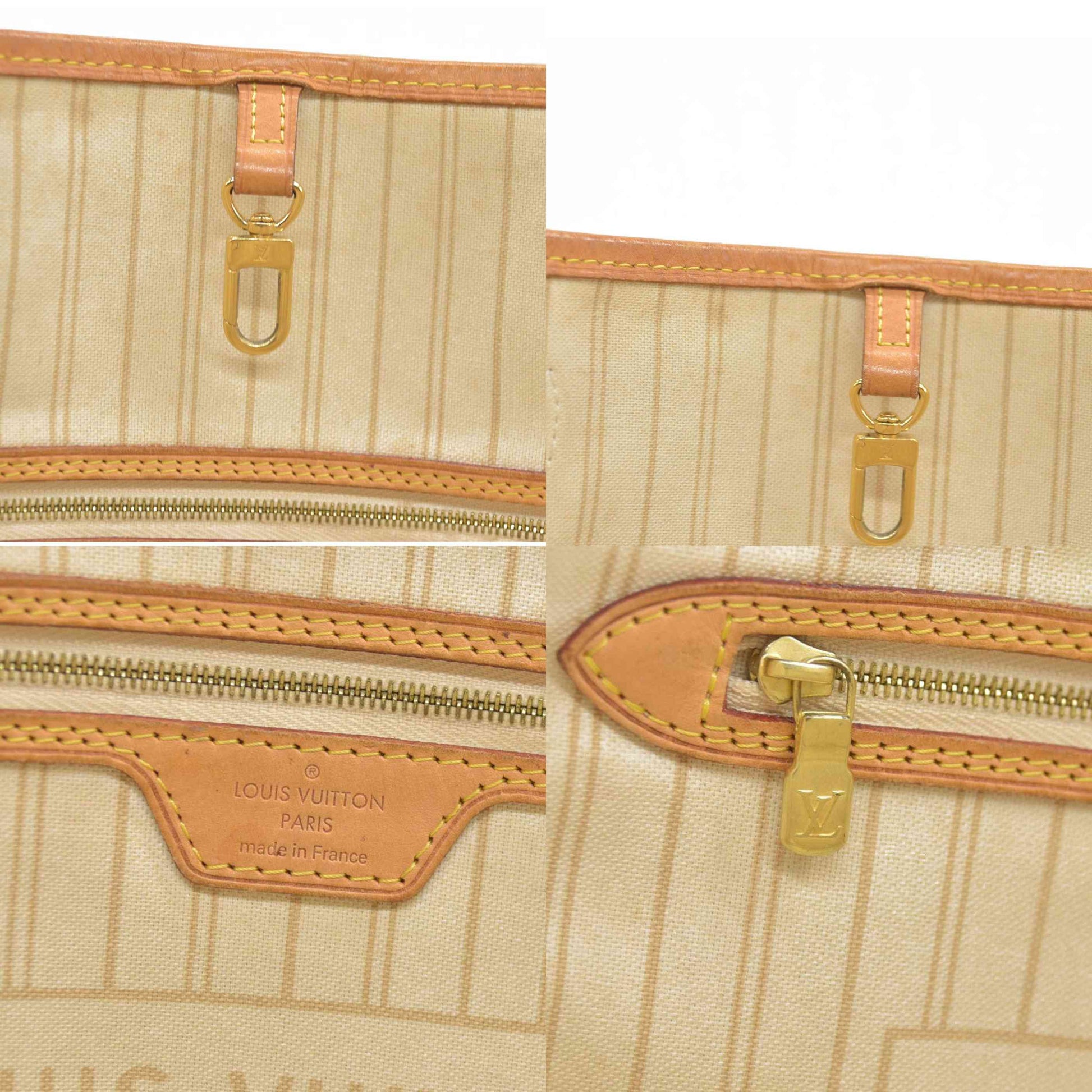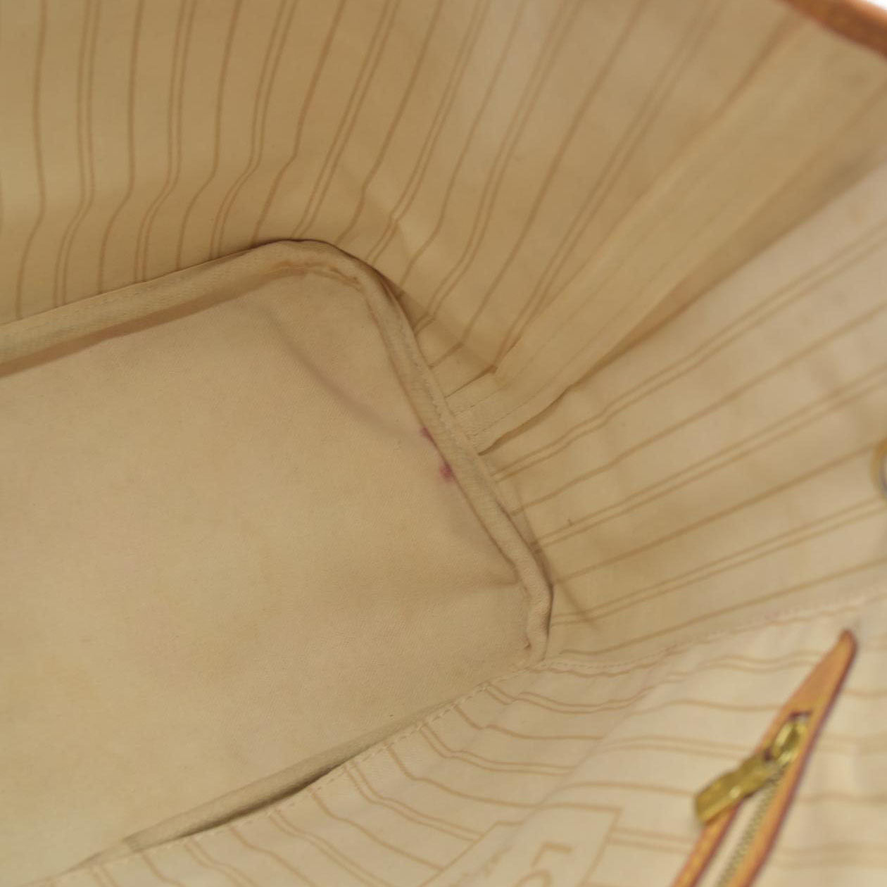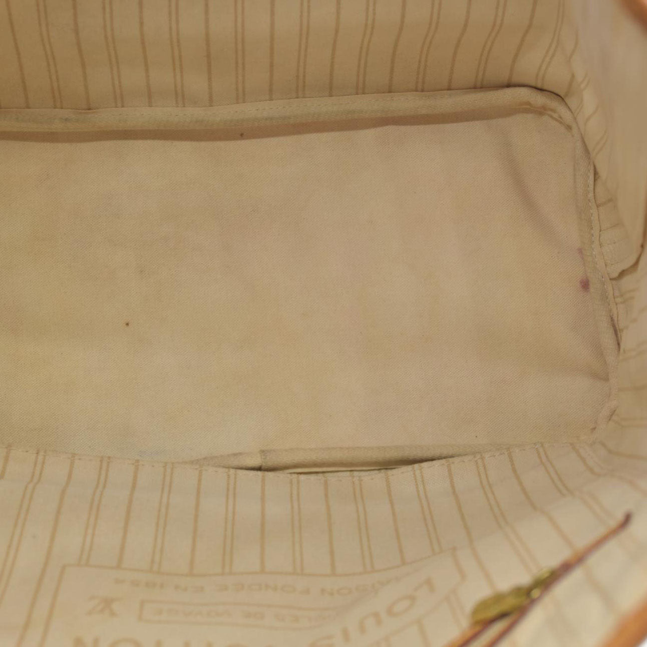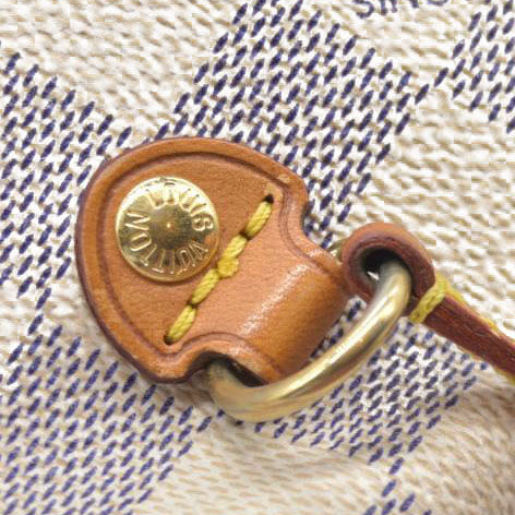 This is an authentic LOUIS VUITTON Damier Azur Neverfull MM. This stylish tote is crafted of Louis Vuitton's signature damier canvas in blue and white. This shoulder bag features vachetta cowhide leather trim, including strap handles and side cinch cords, with polished gold tone hardware. The top is wide and open to a striped white fabric interior with a hanging zipper pocket.