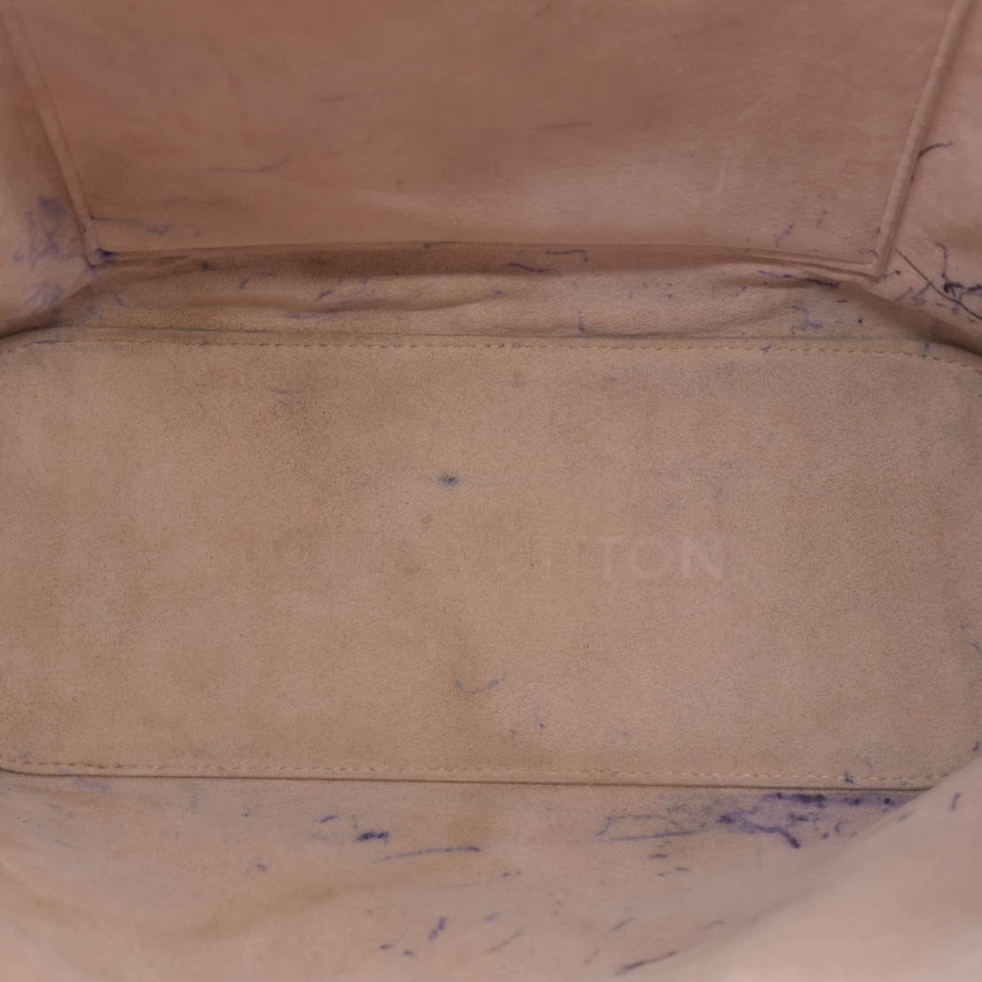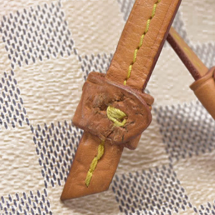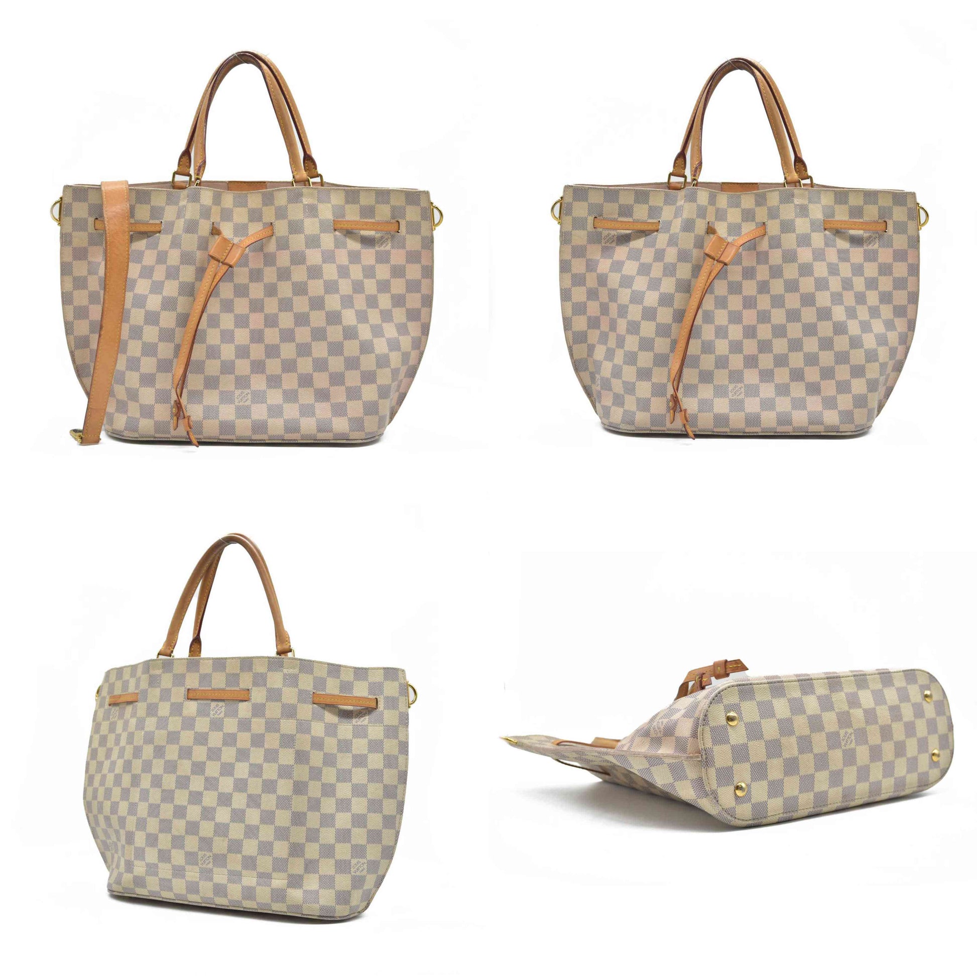 This is an authentic LOUIS VUITTON Damier Azur Girolata. This shoulder bag is crafted of Louis Vuitton's checkerboard coated canvas in blue and white with vachetta leather top handles and removable shoulder strap. The vachetta drawstring opens the bag to a pink microfiber interior with a zippered pocket and patch pocket.